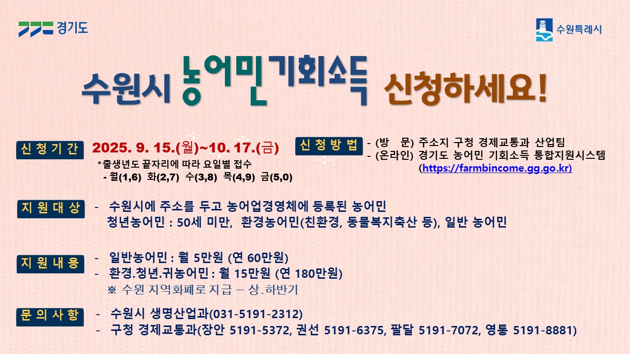수원시 농어민 기회소득 신청 접수 일정입니다.