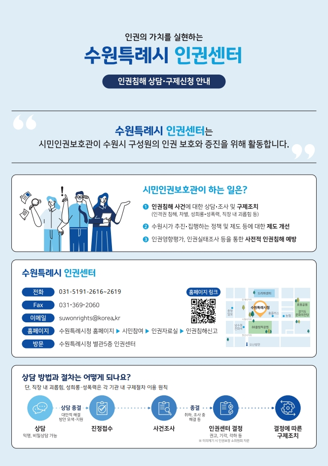 ○ 신청방법 : 전화(☏5191-2616, 2617), 이메일(suwonrights@korea.kr),