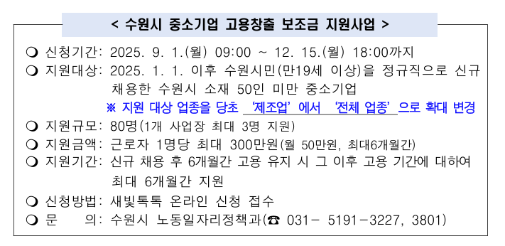 수원시 중소기업 고용창출 보조금 지원사업 확대 시행 홍보