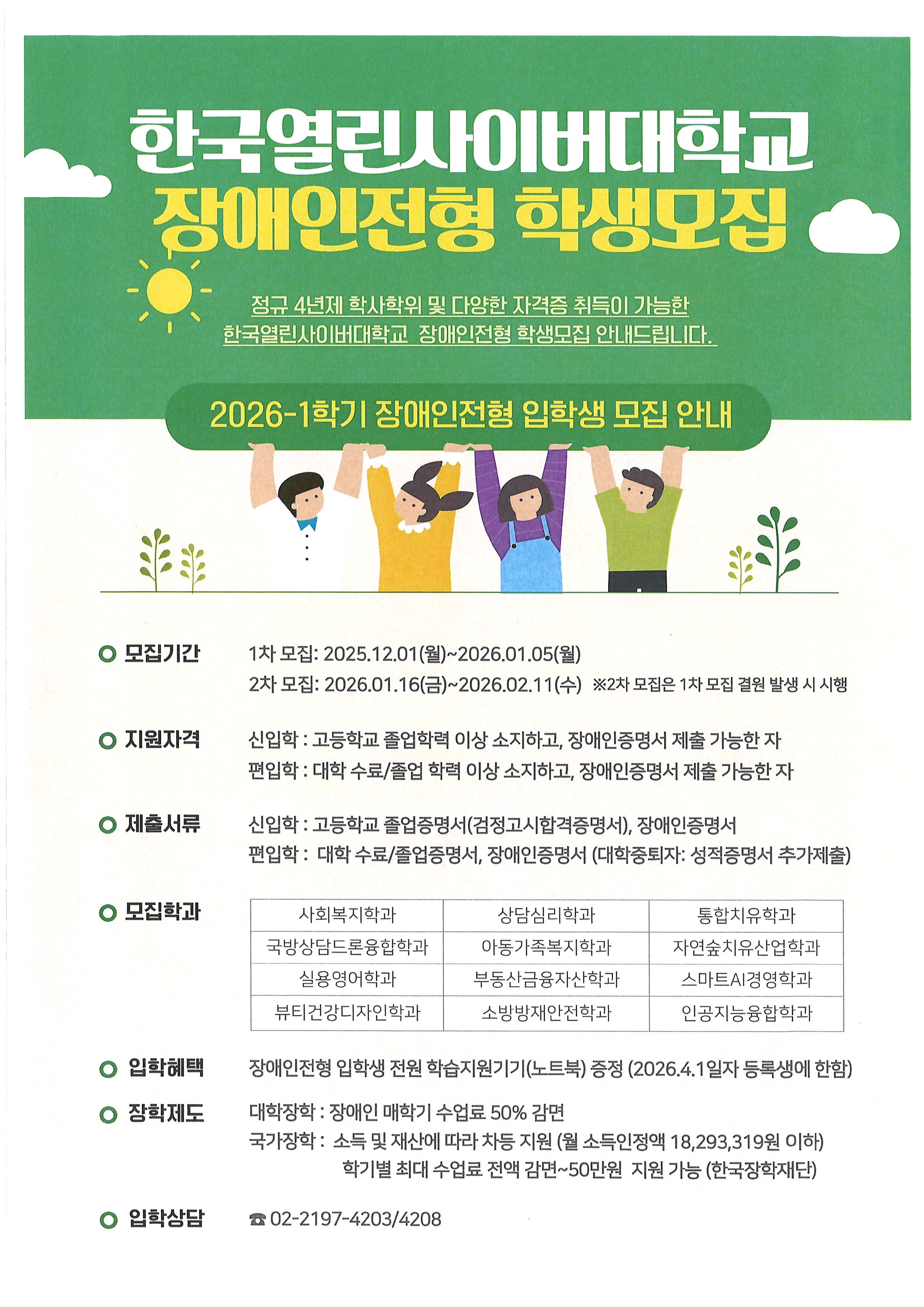 [한국열린사이버대학교] 26-1학기 장애인전형 모집 및 혜택 안내