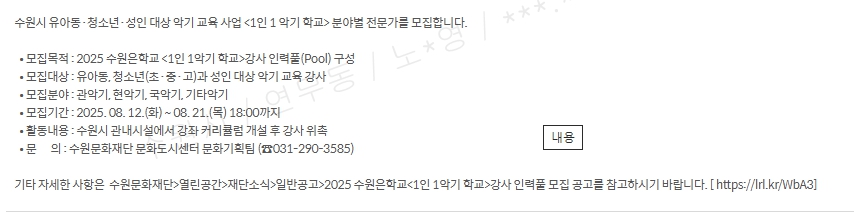 2025 수원 1인 1악기 학교 운영관련 강사 인력풀 모집 안내